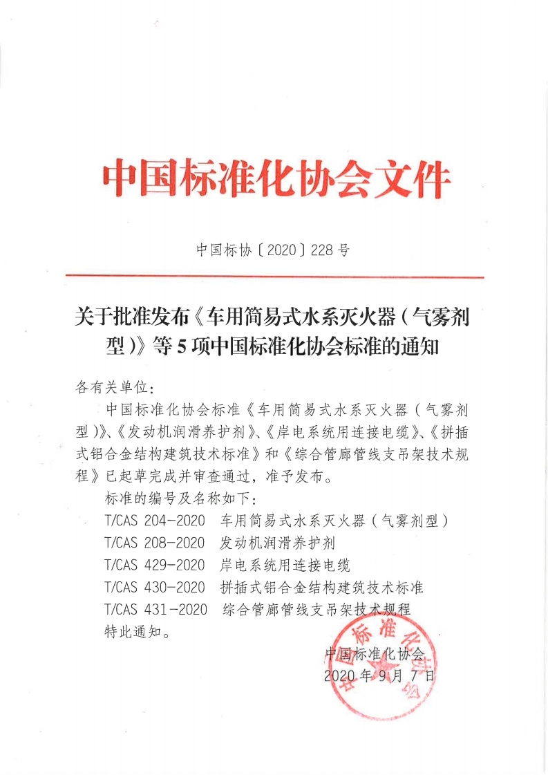 2020-228關于批準發布《車用簡易式水系滅火器(氣霧劑型)》等5項中國標準化協會標準的通知